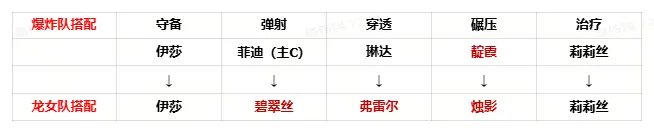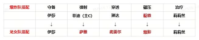 琳达→弗雷尔——原菲迪被替换,无需继续携带琳达增加队伍爆炸伤害。转为携带弗雷尔叠加持续伤害被动。弗雷尔新版本得到加强,加上龙女的业火强化可以为队伍补足伤害。